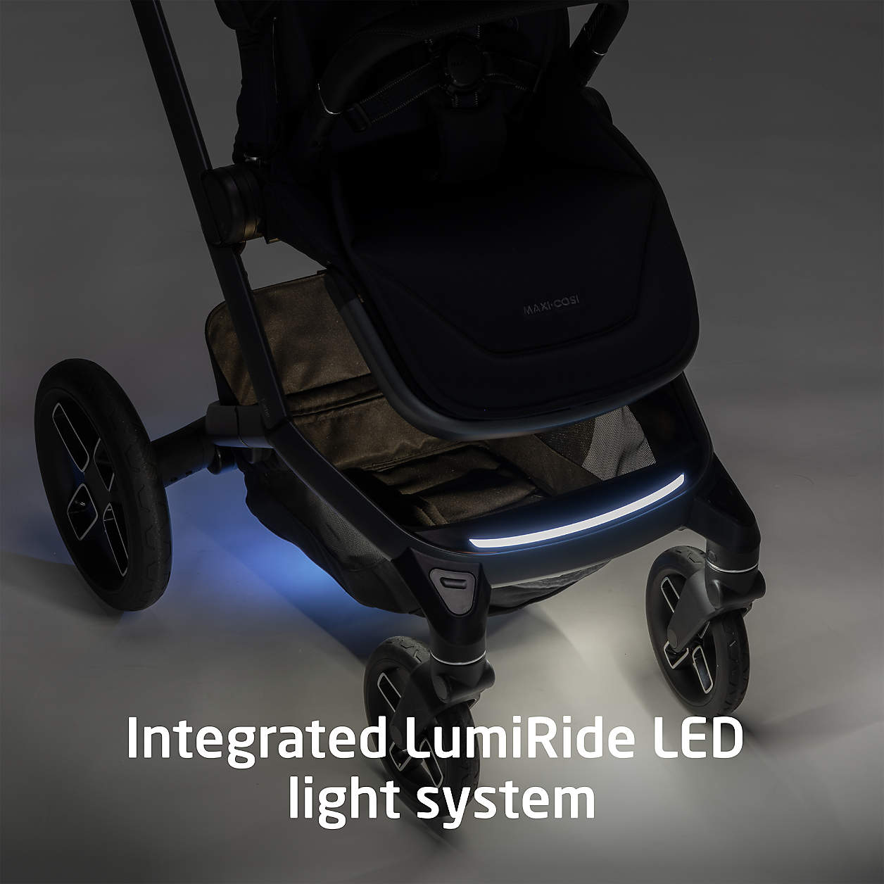 For parents, every detail is thoughtfully engineered. The reversible seat switches seamlessly between parent- and world-facing modes, and the stroller folds down compactly in seconds — self-standing, with the handlebar elevated to stay clean and within reach. Integrated LumiRide LED lights illuminate dark pathways and improve visibility, easily controlled through the Connected Family app. A built-in USB-C power bank keeps your phone charged on the go.